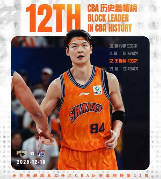 在今晚主場對(duì)陣南京天之藍(lán)的比賽中,王哲林在第2節(jié)送出個(gè)人第2次蓋帽,CBA生涯蓋帽總數(shù)上升至495次,超越易立的494次,升至CBA歷史蓋帽榜第12位!排在他前面的是八一名宿莫科,他送出了526次蓋帽。